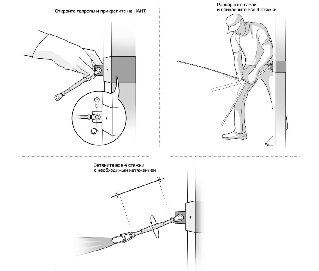 Гамак – изготовлен из синтетической ткани с высокими эксплуатационными характеристиками. Выдерживает равномерную распределенную нагрузку до 160кг. В комплект входят крепежные элементы, талреп 4шт, карабин 4шт.